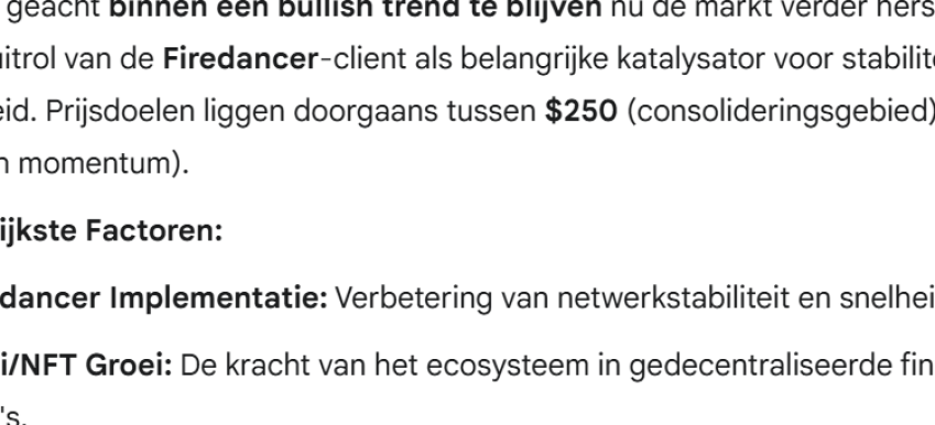 Volgens Gemini AI blijft de Solana koers in een opwaartse trend bewegen en kan de koers tegen het einde van de volgende maand stijgen tot $250 of zelfs $350. Dat zou een verdubbeling betekenen ten opzichte van de huidige prijs rond $173. Een belangrijke factor in deze stijging is de komst van de Firedancer-client, die het netwerk stabieler en sneller moet maken om zo eerdere problemen te voorkomen.