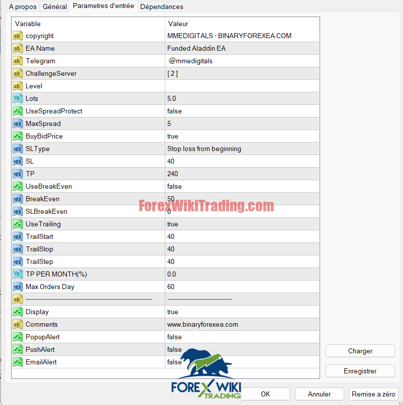 TrailStart), moving in 40-pip increments (TrailStep), with a 40-pip buffer (TrailStop). -