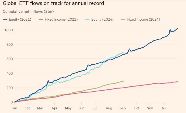 Fixed income ETFs have emerged as a significant contributor to global ETF flows in 2024. As central banks signal potential easing and interest rate cuts, demand for these funds has surged. Investors have channeled $288 billion into fixed income ETFs so far this year, far outpacing the $195 billion seen during the same period in the record-breaking year of 2021. This influx highlights the growing appeal of bond funds as a safer alternative in times of uncertainty.