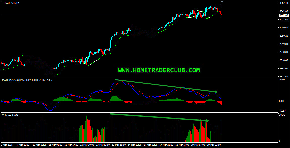 Gold H1(1 Hour) Chart Analysis – Bearish Divergence, Parabolic Sar, Volumes Indicator