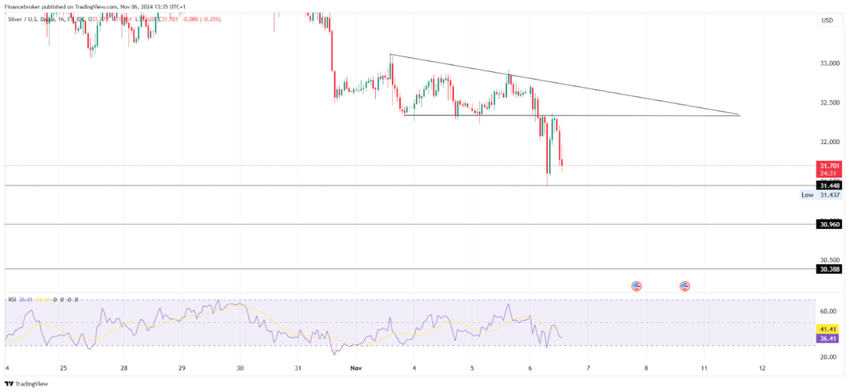 On the 45th Nov 2024 trading session, Silver moved in a sideways direction. Price fails to break both support or resistance on the trading day. Currently, on 6th Nov price was unable to hold on to higher levels and eventually gave a breakdown.