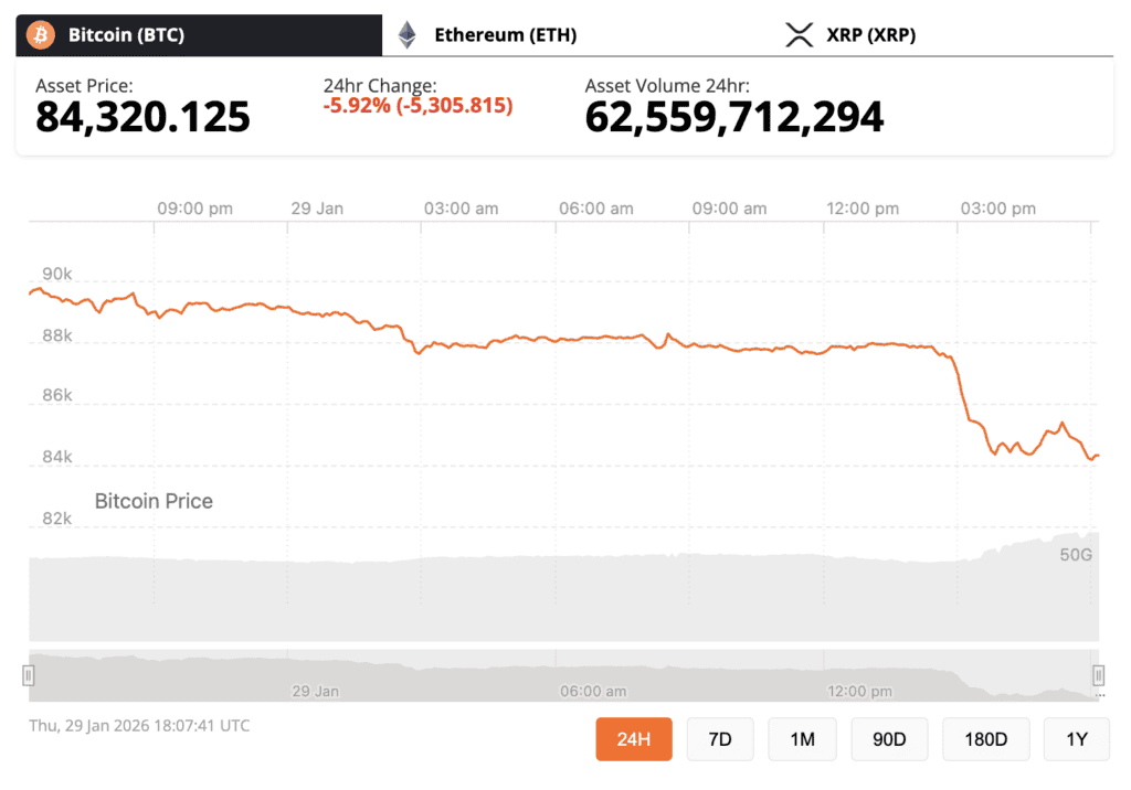 Unlike gold, which had been acting as a macro hedge, Bitcoin entered the session trading more like a risk asset than a refuge. Its price had been hovering near key technical support levels, and when those gave way, the market’s mechanical side took over. Algorithmic selling accelerated the drop. Liquidations cascaded through derivatives markets. What began as a sentiment shift turned into a structural breakdown, dragging Bitcoin toward fresh lows for the year.