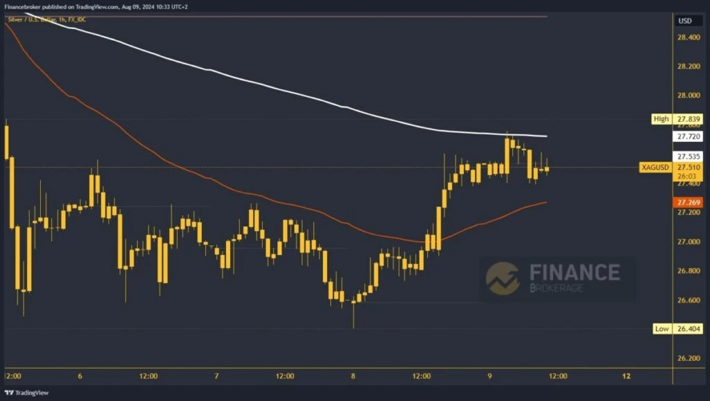 During this morning’s Asian trading session, the price of silver recovered to the $27.75 level. At that level, we encountered the EMA 200 moving average, which did not allow us to continue with further growth. This led to a pullback to $27.40, and we are now trying to hold here. If the pressure on silver continues, the price will have to start a bearish consolidation and continue on the bearish side.
