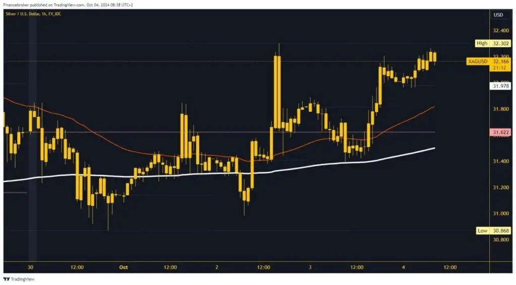The price of silver gained new support this morning at the $32.00 level. After that, we saw a bullish consolidation up to the $32.27 level. Our target is to reach the previous weekly high at $32.30 and form a new one. For something like that, we need a new impulse that would take us above. Potential higher targets are $32.40 and $32.50 levels. Last week’s high was at $32.71.