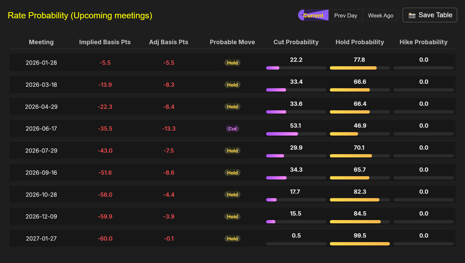 - Expectations that the Fed will cut rates at the next meeting on January 28 remain unchanged at 22%, according to Capital Edge Rate probability data. Nonetheless, for the full year ahead, investors had priced 60 basis points of easing, with the first cut expected in June.