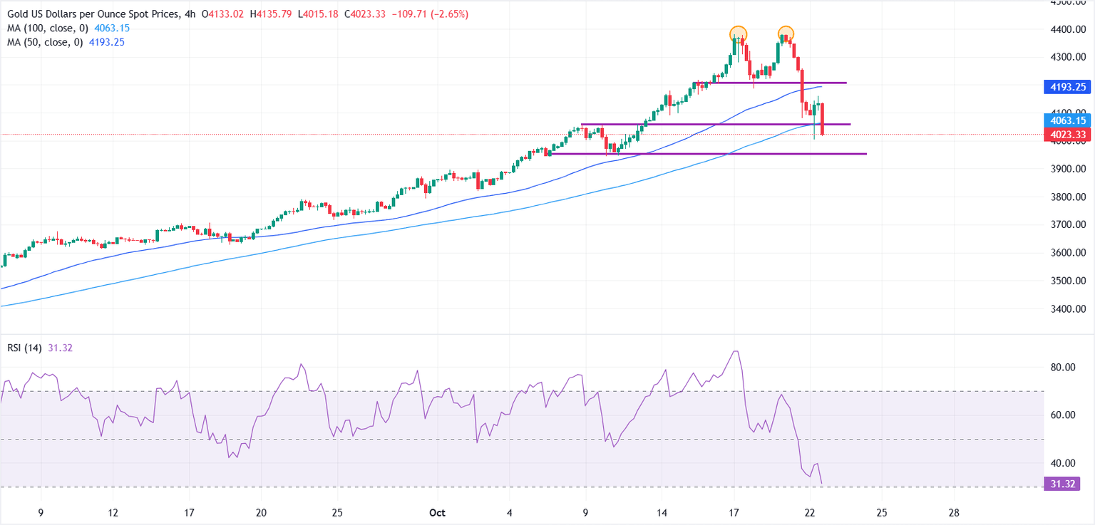 Bargain hunters are stepping in near the $4,000 psychological mark, but the rebound so far remains shallow. The yellow metal suffered its biggest one-day decline since August 2020 on Tuesday, plunging over 5% as investors rushed to lock in profits following an overextended rally to $4,380. The correction was long overdue, with momentum indicators flashing signs of exhaustion in recent sessions.