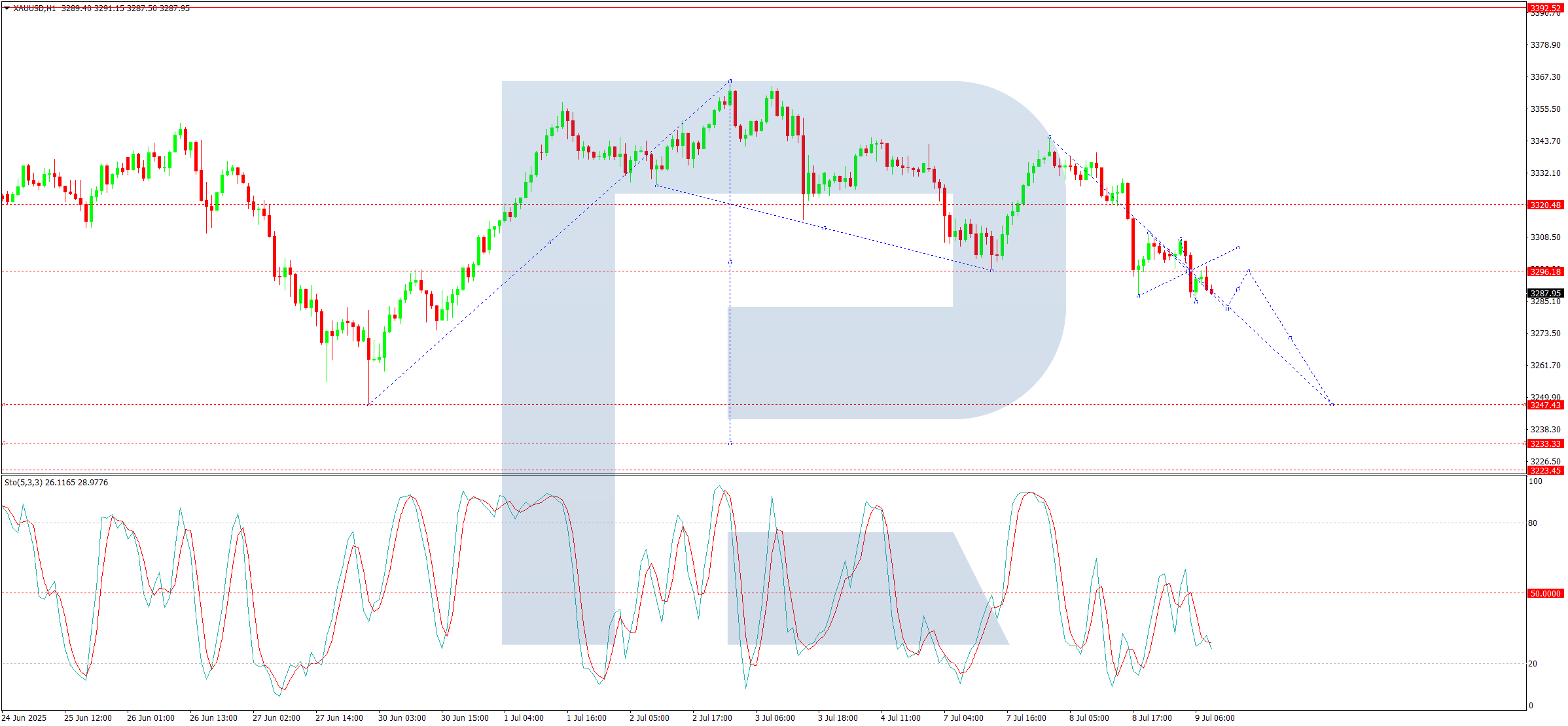 The pair has established a downward wave to 3,286, followed by a tight consolidation range near 3,296. Today, we anticipate a drop to 3,282, followed by a retest of 3,296 (from below). A breakout below this range could extend losses towards 3,247 – a near-term target. The Stochastic oscillator aligns with this view, with its signal line sitting below 50 and trending downward towards 20.