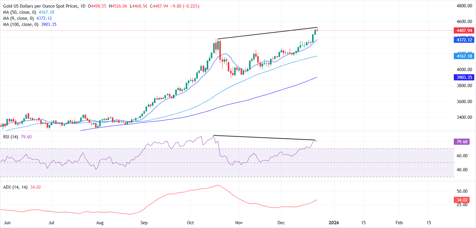Gold (XAU/USD) trades on the back foot on Wednesday after surging to a fresh all-time high near $4,526 earlier in the day. Volatility picked up amid thin holiday liquidity ahead of Christmas, encouraging mild profit-taking at elevated levels. At the time of writing, XAU/USD trades around $4,470, up nearly 3% this week.