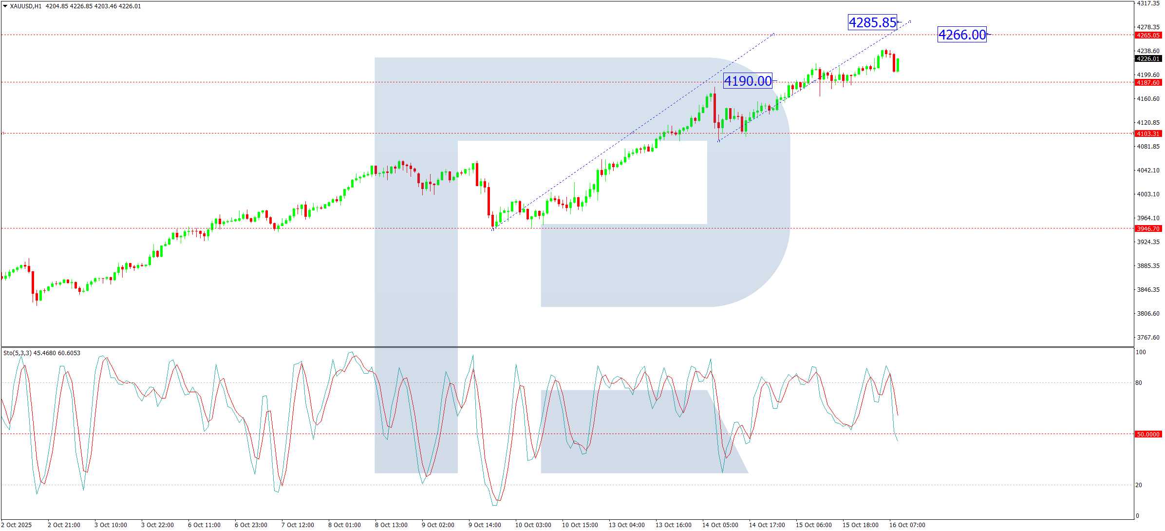 On the H1 chart, the instrument decisively broke above the 4,190 USD resistance, consolidating around this level before extending its gains towards 4,266 USD. A period of profit-taking is expected here, likely triggering a retracement to retest 4,190 USD as support. A successful hold above this level could signal a resumption of the uptrend, targeting 4,300 – 4,400 USD. The Stochastic oscillator aligns with this view, with its signal line positioned above 50 and advancing towards 80, reflecting sustained bullish momentum.
