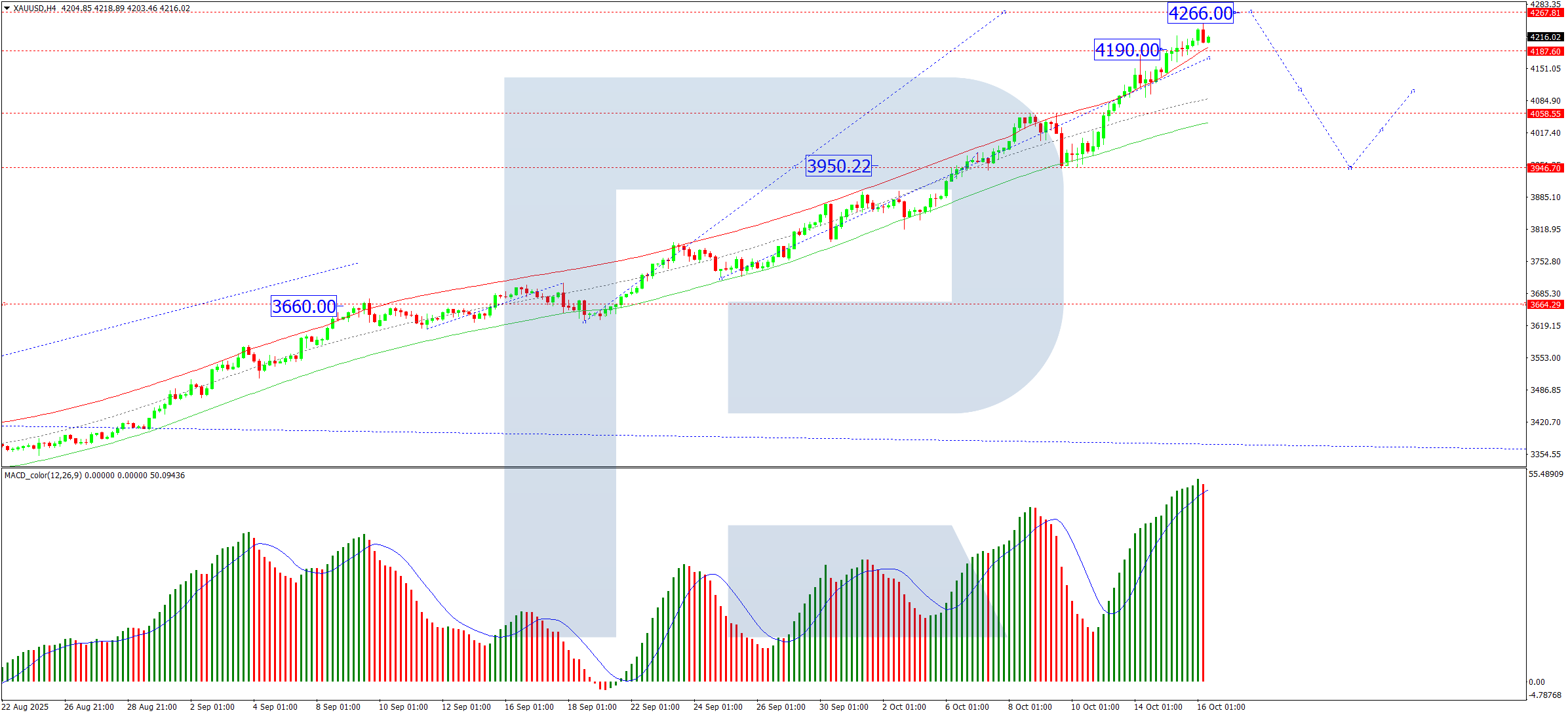 On the H4 chart, gold found strong support at 4,190 USD and is advancing towards an initial target of 4,266 USD. Upon reaching this level, a corrective pullback towards 4,100 USD is anticipated. Provided the broader bullish structure holds, this could establish a foundation for a subsequent upward wave, with potential targets at 4,300 – 4,400 USD. The MACD indicator corroborates this constructive outlook. Its signal line is firmly above zero and trending higher, confirming the current dominance of buyers.