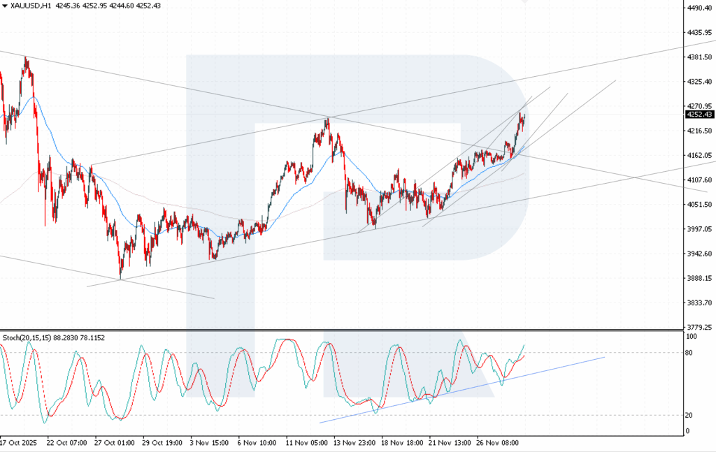 The session’s technical outlook suggests the potential for a minor bearish correction, followed by a renewed push toward 4,345 USD, where the upper boundary of the bullish channel lies. The Stochastic Oscillator provides an additional positive signal, as its signal lines are rebounding from an ascending trendline, supporting the potential for further gains.