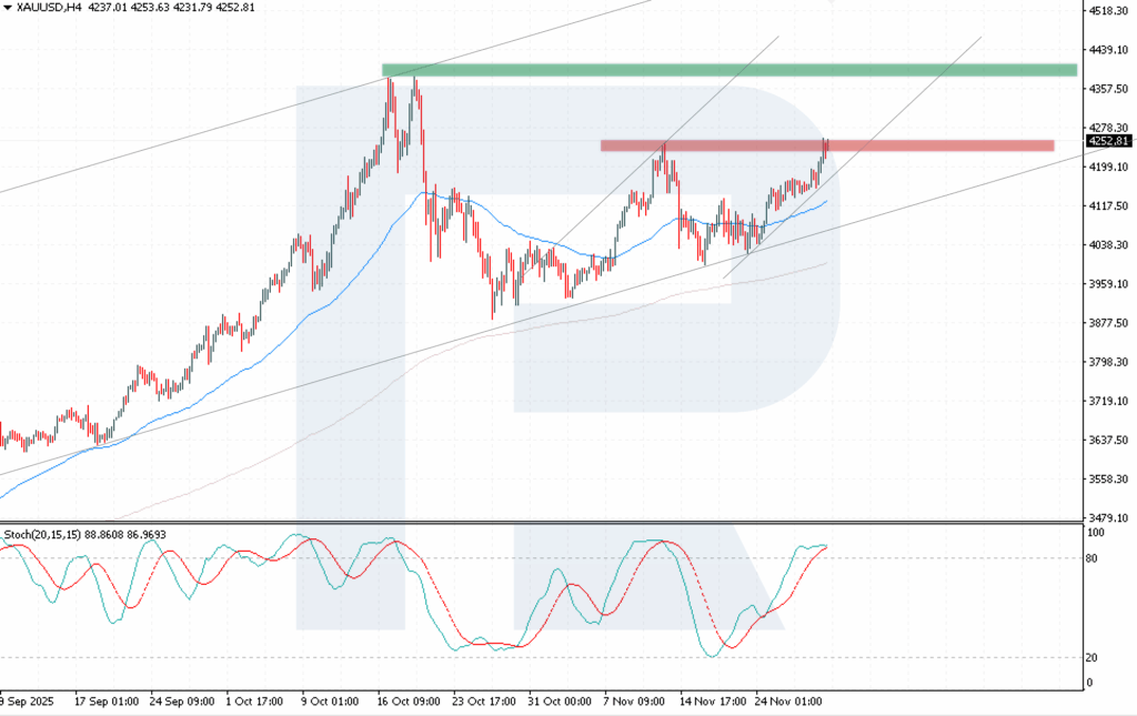 The Stochastic Oscillator supports the upward bias, with its signal lines positioned above 80 and yet to cross, indicating persistent bullish momentum. A deeper correction would require a break and close below the lower boundary of the bullish channel, particularly below 4,185 USD.