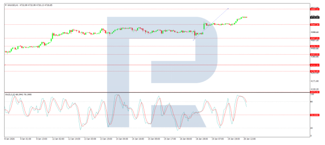 On the H1 chart, the price has broken through the 4,717 level, forming a consolidation range around it. The trend is likely to continue towards 4,800, with the Stochastic oscillator confirming this bullish outlook, as the signal line remains below 20 and under upward pressure.