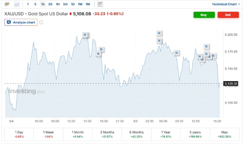 The intraday Investing.com chart shows gold trading near $5,108, down about 0.65%, as short-term profit-taking follows the recent surge toward record levels. Despite the mild pullback, geopolitical tensions continue to keep gold firmly in safe-haven demand, limiting deeper downside pressure. Price action remains volatile but stable above the $5,100 region, indicating that buyers are still defending key levels as global uncertainty persists.