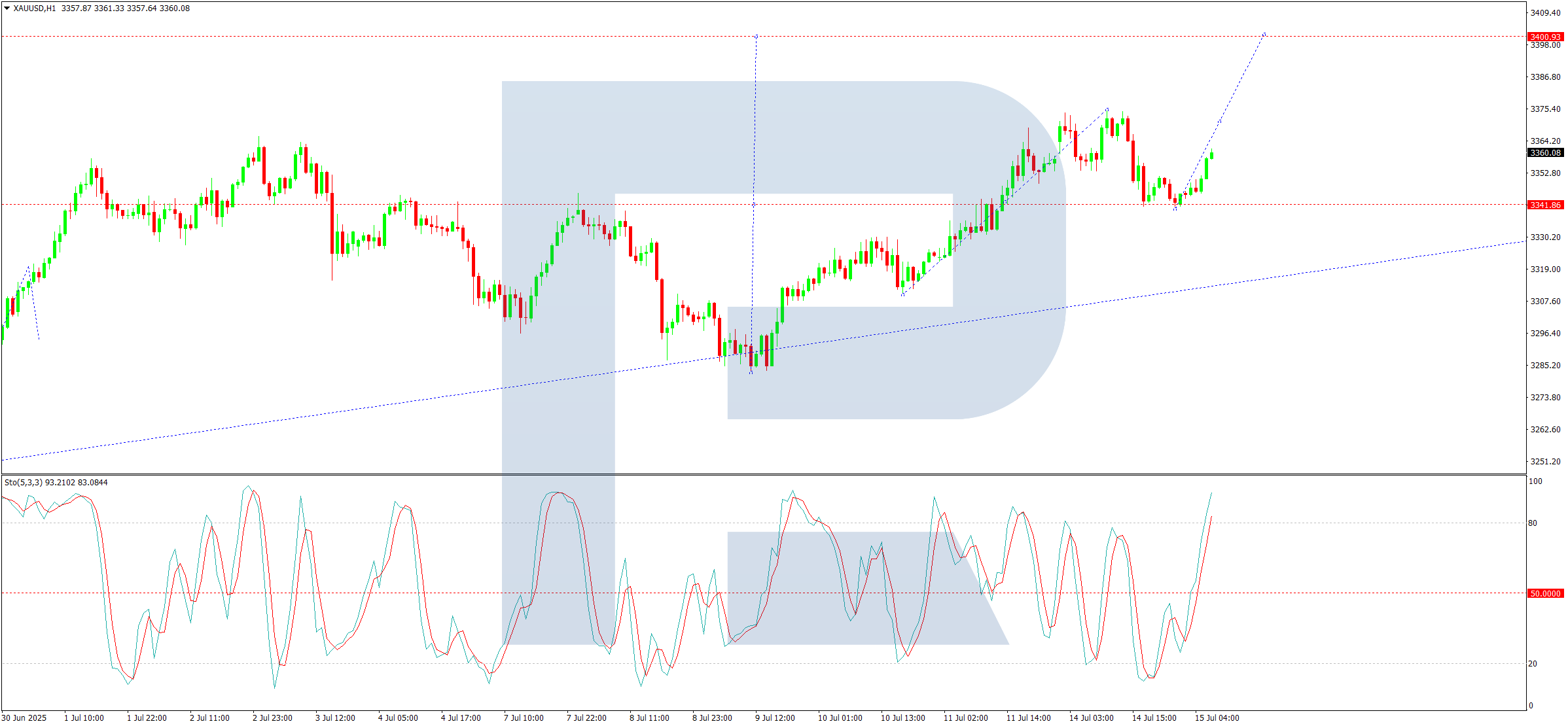 On the H1 chart, the correction to 3,340 has completed, and the next growth wave towards 3,400 is underway. Today, we expect an advance to 3,370, after which a brief consolidation phase may form. A breakout above this range would reinforce bullish momentum towards 3,400. The Stochastic oscillator aligns with this outlook, with its signal line above 50 and rising sharply towards 80.