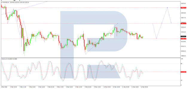 On the H1 chart, the market broke above the 5,135 USD level and completed a growth wave to 5,233 USD, before retracing to 5,140 USD. Looking ahead, the likelihood of a new growth wave developing towards the 5,262 USD level will be considered. The Stochastic oscillator supports this scenario, with its signal line remaining above the 50 level and retaining upside potential towards level 80.