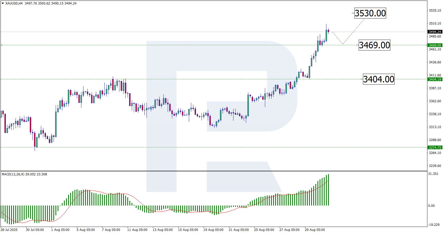 Gold prices extended their rally on Tuesday, reaching 3,490 USD per troy ounce, approaching an all-time high. The metal found support in growing expectations of a Federal Reserve rate cut as soon as September, along with a concurrent weakening of the US dollar.