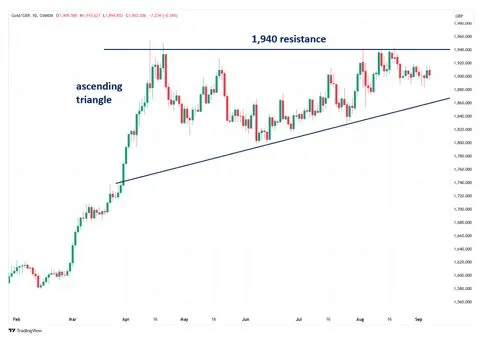 Similarly, gold priced in British pounds is forming an ascending triangle with resistance at 1,940 pounds per ounce. A breakout here would signal strong bullish momentum, potentially driving prices higher across other currencies. The formation of these ascending triangles in multiple currencies is a key bullish sign, suggesting that a widespread rally is imminent.
