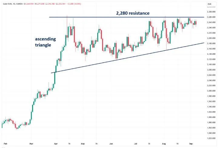 For gold, the ascending triangle pattern is visible in several major currencies, including euros, British pounds, and Swiss francs. In each case, gold is approaching key resistance levels that, if broken, could trigger a powerful rally. For instance, gold priced in euros is nearing the critical resistance of 2,280 euros per ounce. A break above this level could lead to a surge in buying, further supporting the gold price breakout.