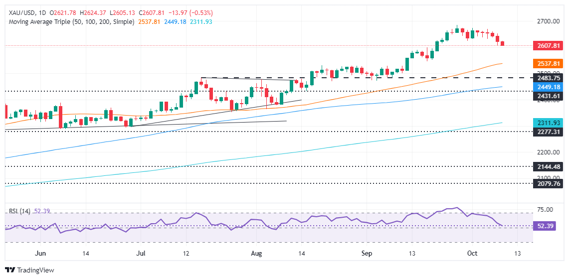 XAU/USD has tumbled below $2,620. A breach of $2,600 will expose the psychological $2,550 mark ahead of the 50-day Simple Moving Average (SMA) at $2,537. Once these levels are surpassed, the $2,500 figure is up next.