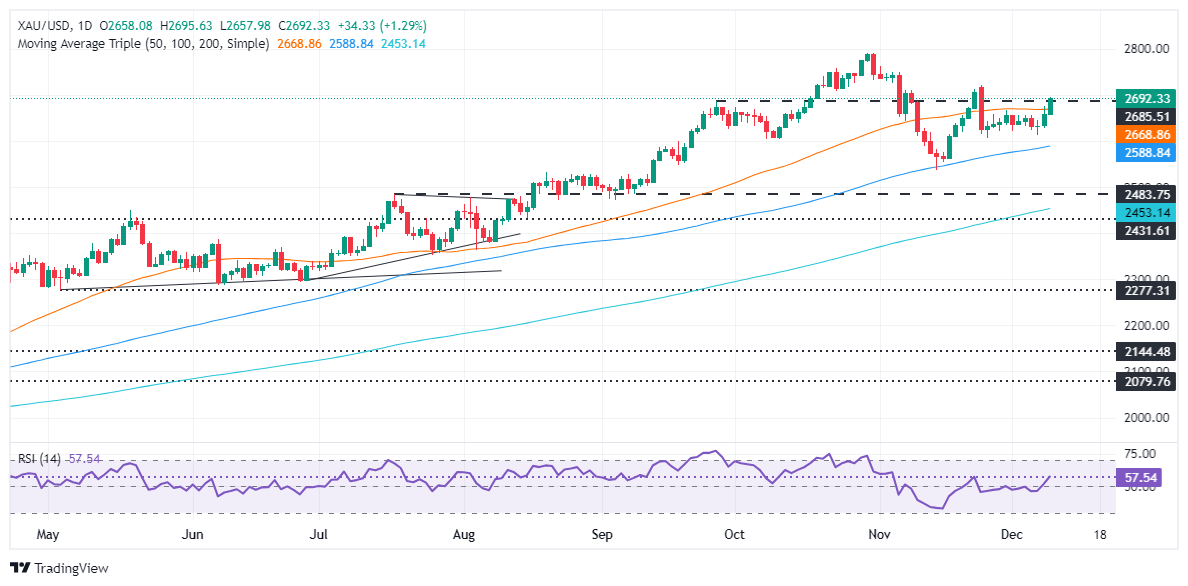 Gold climbed during the North American session on Tuesday with buyers eyeing the $2,700 mark for the first time since November 25. One of the drivers of the rise in the price of the yellow metal is the expectation that the Federal Reserve (Fed) will cut rates at the December meeting. At the time of writing, the XAU/USD trades at $2,694, up by 1.32%.