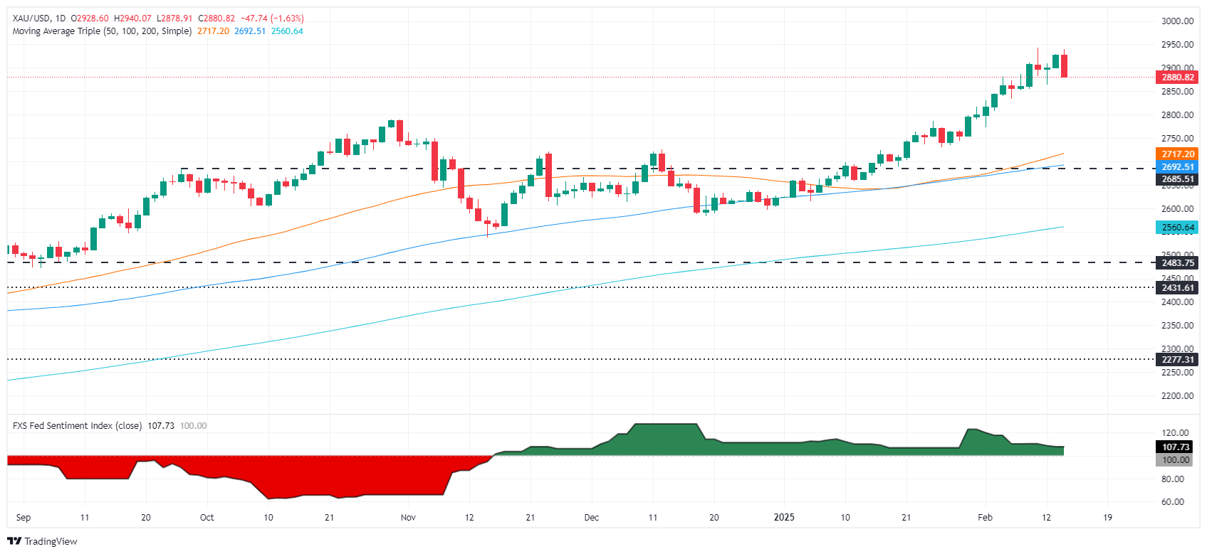 Gold price uptrend remains intact, though it is retracing and has hit a two-day low of $2,878. It should be said that the Relative Strength Index (RSI) exited from overbought territory after staying there for most of February. Therefore, XAU/USD’s drop might be halted if buyers defend the February 12 daily low of $2,864.