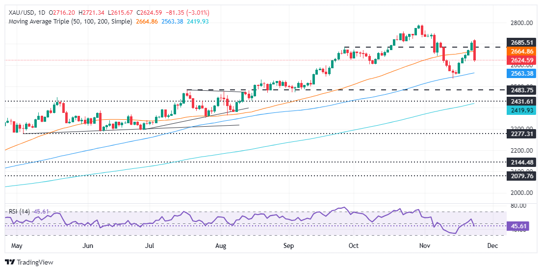 Gold’s price rally halted on Monday as sellers pushed XAU/USD beneath the $2,700 figure, prolonging its drop below $2,630. If bears clear the latter, the next support would be $2,600. If surpassed, a move to the 100-day SMA of $2,562 is on the cards, immediately followed by the November 14 swing low of $2,536.