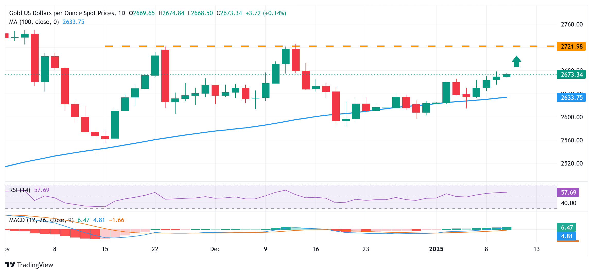 From a technical perspective, this week’s breakout through the $2,665 horizontal resistance was seen as a fresh trigger for bullish traders. Given that oscillators on the daily chart have just started gaining positive traction, the Gold price seems poised to climb further to the $2,681-2,683 intermediate hurdle and then aim to reclaim the $2,700 round-figure mark.