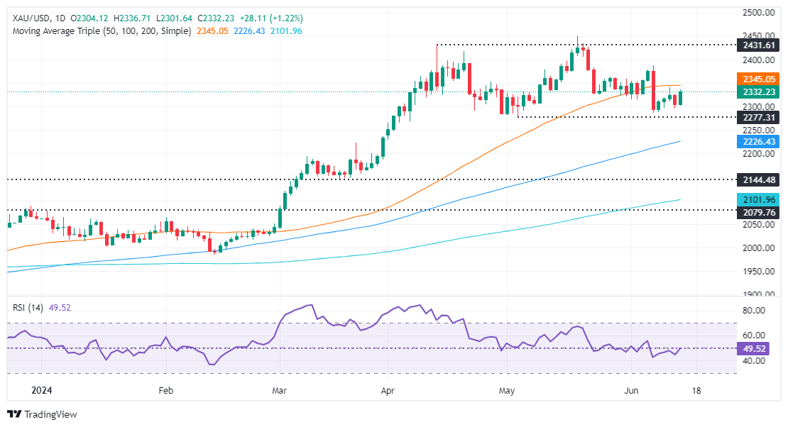 The XAU/USD trades at $2,333, gaining more than 1.30% after bouncing off daily lows of $2,301. Sentiment remains sour, yet US equities recovered some during the last hour of trading, with the Nasdaq up 0.28%, while the S&P 500 trims its earlier losses, shy of being flat on the day at -0.10%.
