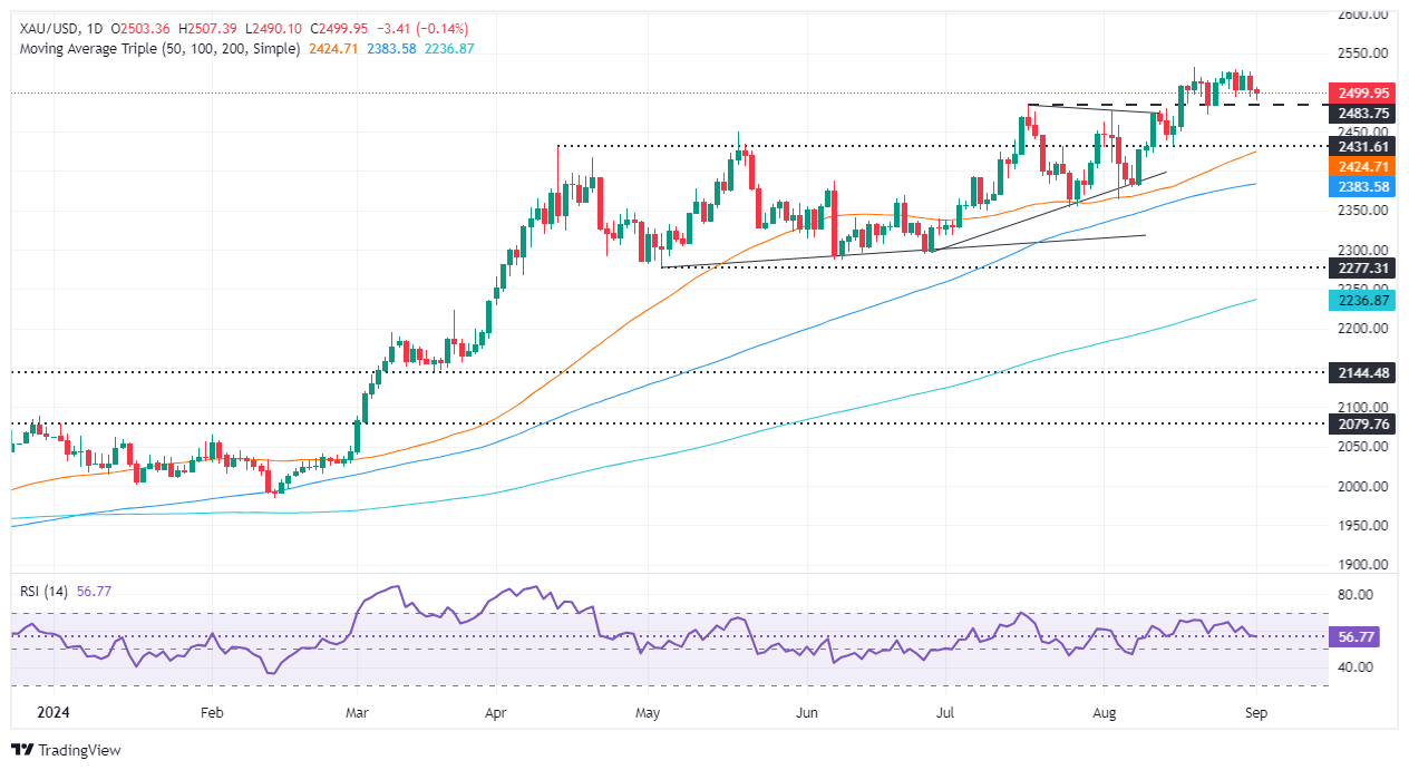 If XAU/USD drops below $2,500, the next support would be the August 22 low at $2,470. Once surpassed, the next stop would be the confluence of the August 15 swing low and the 50-day Simple Moving Average (SMA) near the $2,424-$2,431 area.