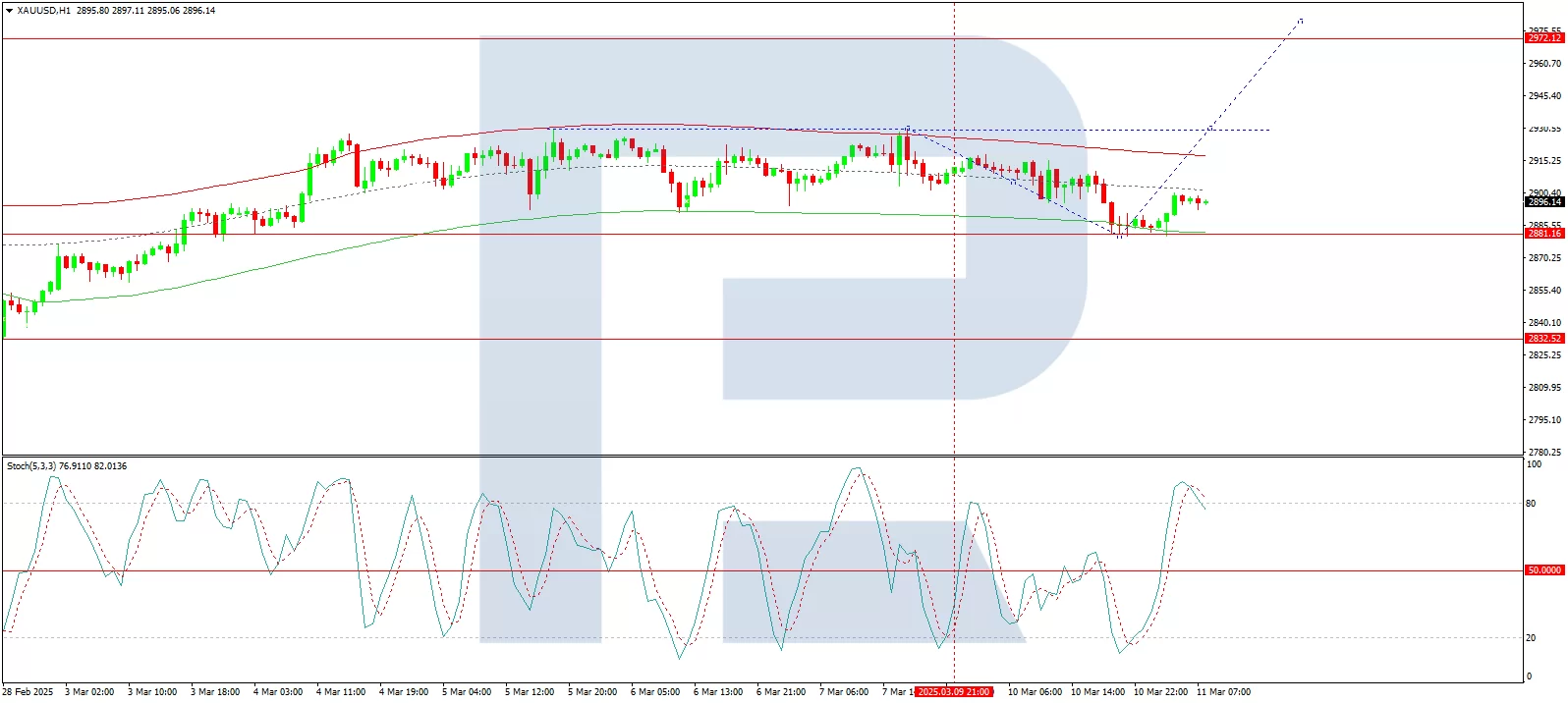 On the H1 chart, Gold completed a correction wave to 2,880 USD, and the market is now forming a new growth wave towards 2,906 USD, which is expected to be reached today. A subsequent potential pullback to 2,891 USD may occur, forming a consolidation range around this level. If Gold breaks downward from this range, a correction to 2,860 USD is possible before a renewed upward move. However, an upward breakout would open the path towards 2,980 USD. The Stochastic oscillator confirms this scenario, with its signal line above 80 and pointing firmly upward.