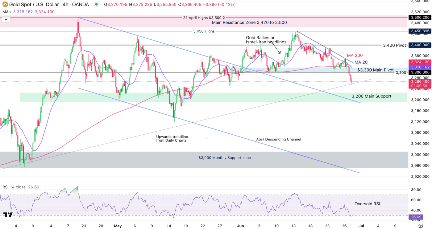 Gold is facing headwinds as bulls failed to retest earlier All-time highs ($3,500) even as global markets went ablaze through the past week war-induced volatility.
