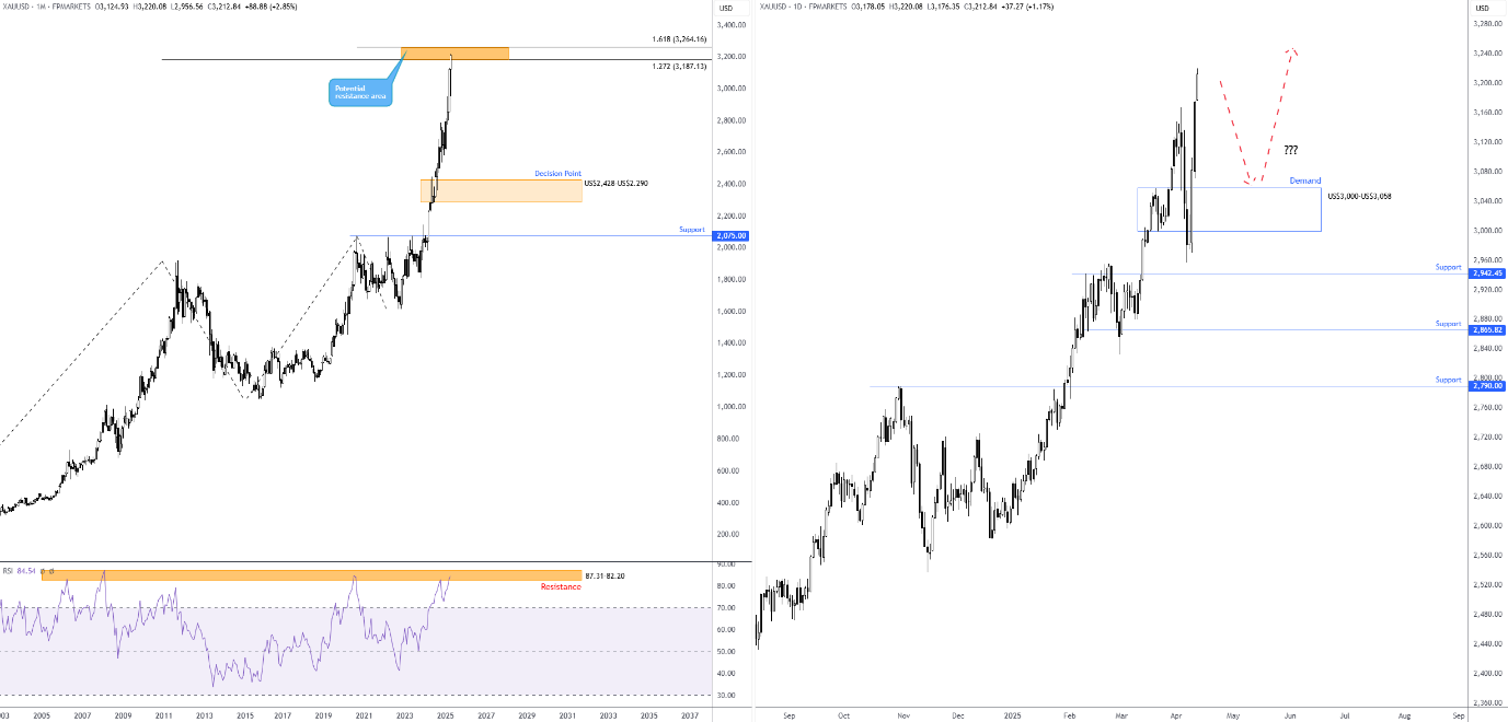 With Gold firmly entrenched in a strong uptrend, dip-buyers could emerge from the daily demand area if a correction occurs. That said, given technical indicators on the monthly chart suggesting buyers could pump the brakes, any dip-buying activity would likely be approached with caution. Confirmation – such as a bullish candlestick signal or supporting price action on lower time frames – might be required before pulling the trigger. However, any movement below the mentioned demand area signals bearish strength from the monthly resistance zone, and potentially opens the door to short-term selling opportunities, targeting daily support at US$2,942, closely followed by support at US$2,865, and possibly US$2,790.