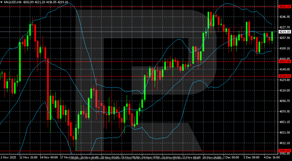 On the H4 chart, gold (XAU/USD) is consolidating after its recent advance toward 4,220–4,230 USD. The price remains above the middle Bollinger Band, with the upper band turning slightly upward, suggesting an attempt to recover from recent weakness.