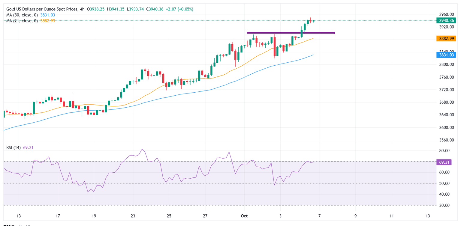 Gold (XAU/USD) extends its historic run beyond $3,900 on Monday, notching one record high after another as the prolonged United States (US) government shutdown, dovish Federal Reserve (Fed) bets, and renewed political jitters in Europe keep safe-haven demand elevated.