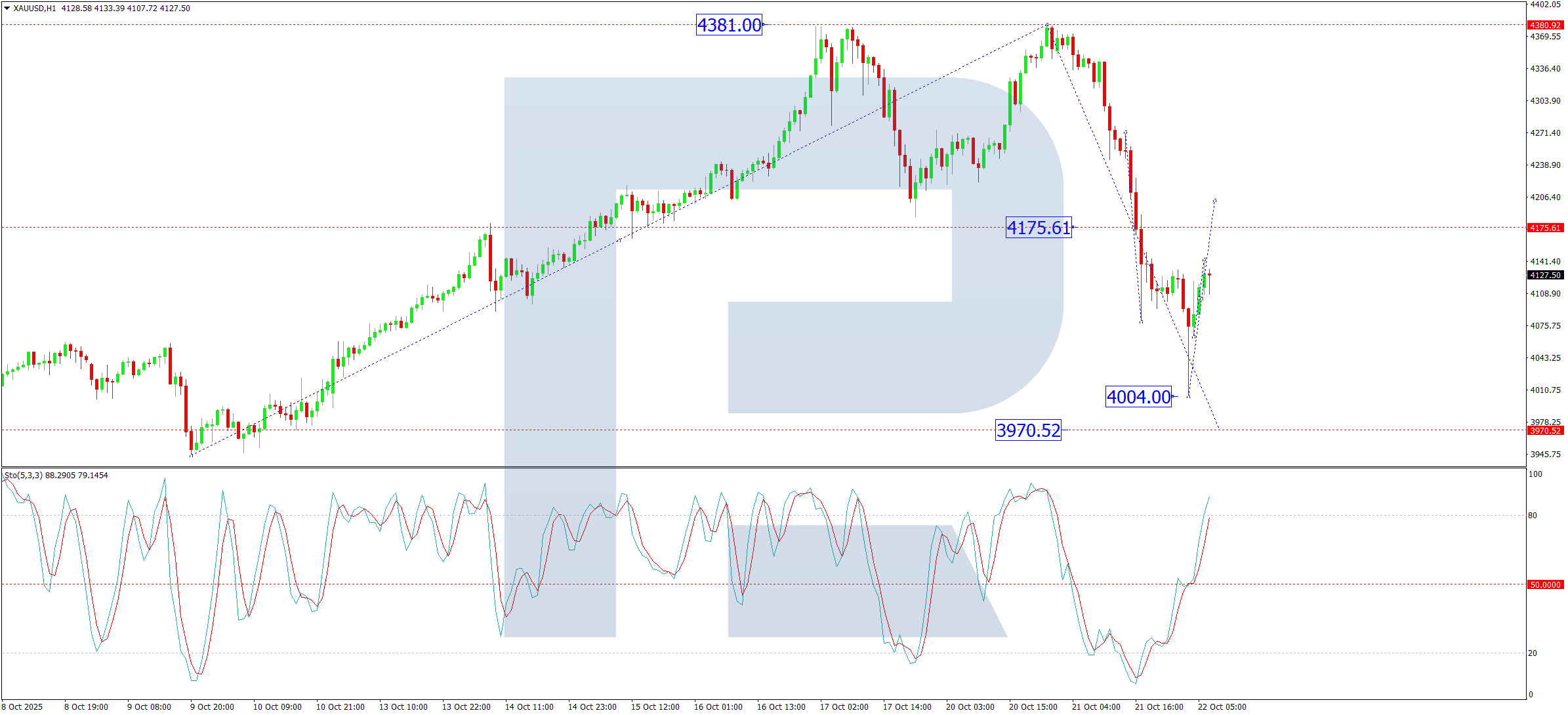 On the H1 chart, the instrument completed a downward wave to 4,004 USD before establishing a growth structure. The price is currently consolidating around 4,107 USD. An upward breakout from this range would likely propel prices toward 4,175 USD, retesting the previously breached support level. The Stochastic oscillator supports this short-term bullish scenario, with its signal line positioned above 50 and advancing toward 80, reflecting building upward momentum.