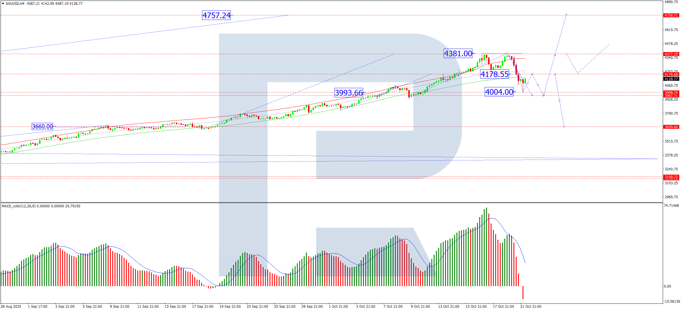 On the H4 chart, XAU/USD broke below the 4,175 USD support level, reaching the initial corrective target at 4,004 USD. The market is currently forming a retracement towards 4,175 USD, testing this former support level from below. Following the completion of this pullback, another leg down is anticipated within the broader correction, with a subsequent target at 3,970 USD. The MACD indicator confirms this bearish near-term outlook: its signal line is pointing downward while the histogram remains entrenched in negative territory, indicating continued selling pressure.