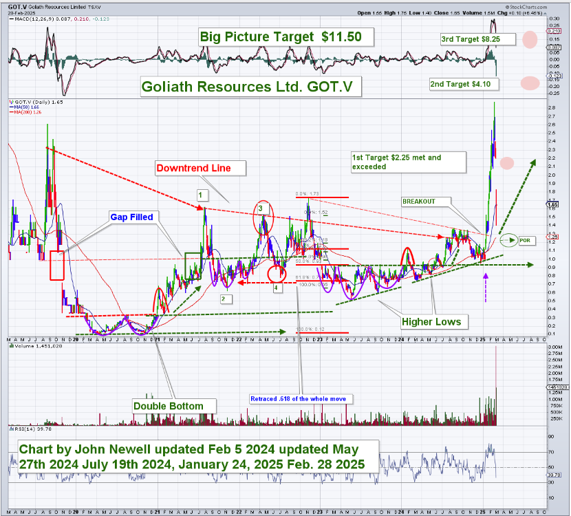 Significant shareholders include Crescat Capital, Eric Sprott, Rob McEwen, and a global commodity group based in Singapore. Dr. Quinton Hennigh serves as a technical advisor. Since our last article on Goliath Resources Ltd. (GOT.V), the company has exceeded its first price target of $2.25, demonstrating strong technical and fundamental performance. The breakout from its long-term downtrend and the series of higher lows have reinforced its upward momentum. The stock is now advancing toward its second target of $4.10, with an ultimate big-picture target of $11.50.