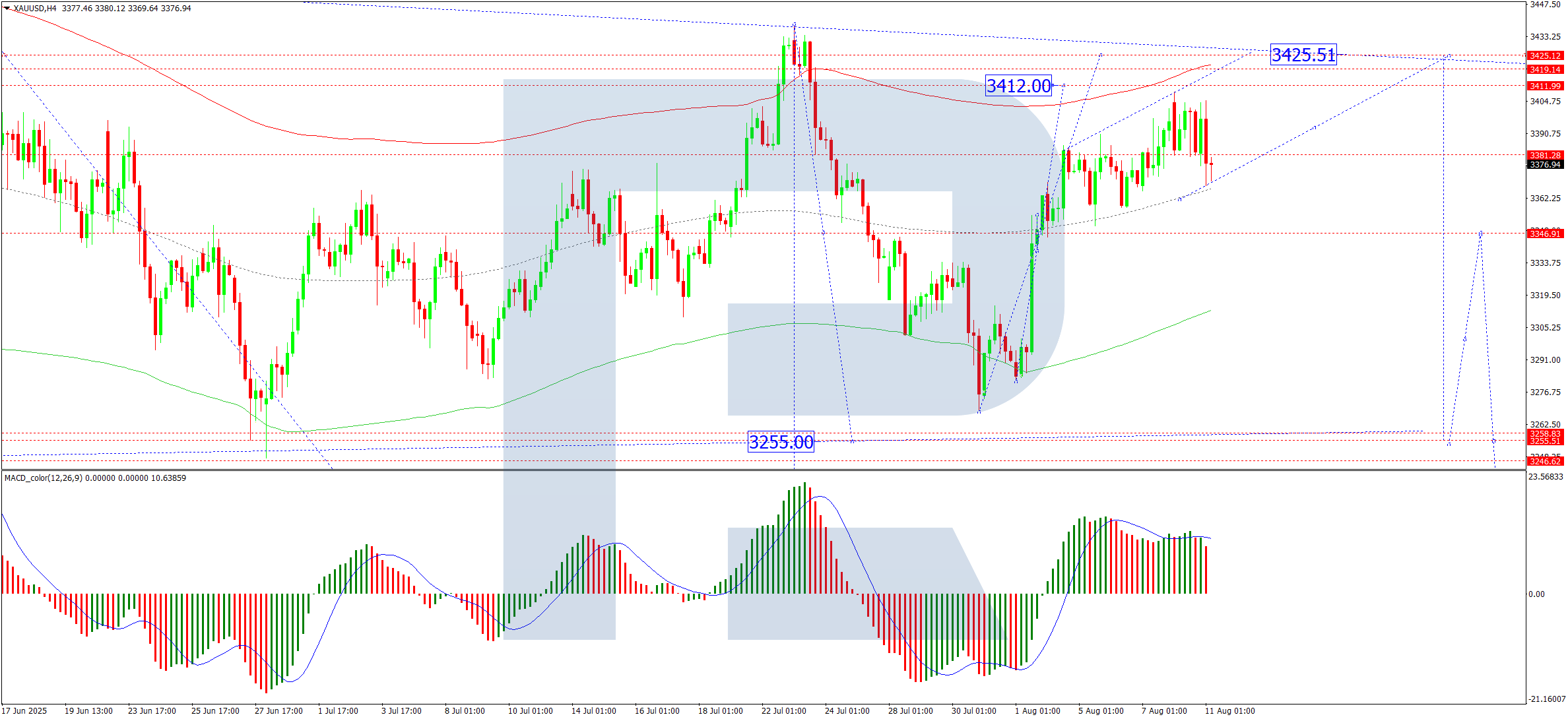 The XAU/USD pair is consolidating broadly around 3,383 USD, with recent swings extending between 3,408 USD (upper bound) and 3,367 USD (lower bound). Today, we anticipate a rise towards 3,420 USD, potentially stretching to 3,425 USD, followed by a fresh downward wave targeting 3,345 USD. A break below this level could extend losses to 3,255 USD. This outlook is supported by the MACD indicator, where the signal line remains above zero and points firmly upward.