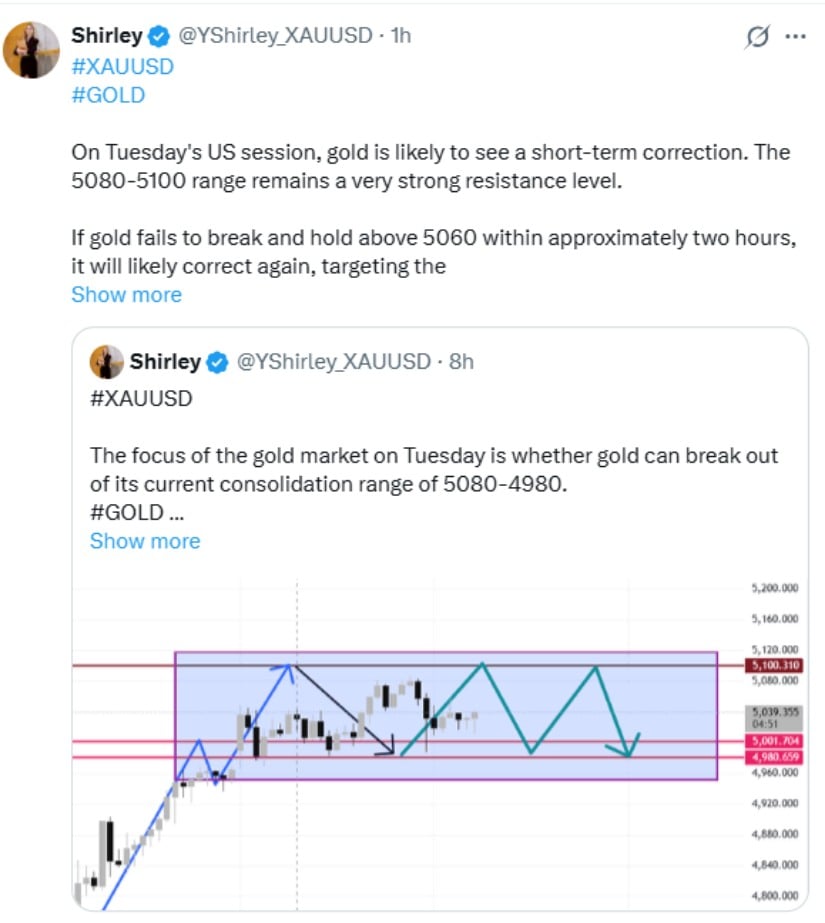 Gold trades near $5,053, at risk of a short-term pullback if it fails to hold above $5,060. Source: Shirley via X