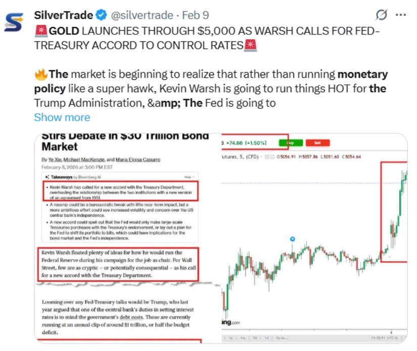 Gold futures hit $5,054 on bullish sentiment from proposed Fed-Treasury coordination amid inflation concerns. Source: SilverTrade via X