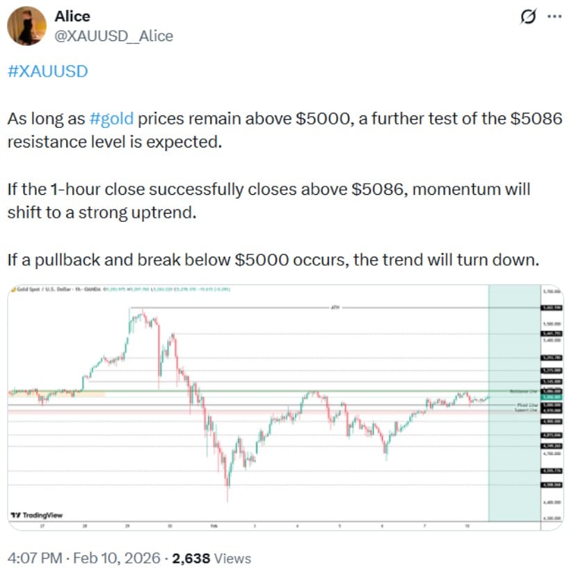 Gold consolidates near $5,050, with $5,000 support and $5,086 resistance signaling potential uptrend or downside risk. Source: Alice via X