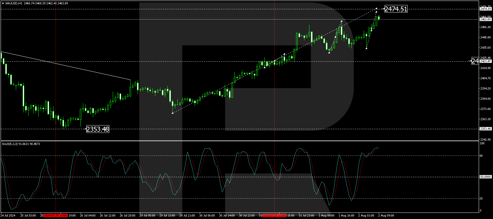 On the H1 chart of XAU/USD, the market has formed a consolidation range around 2446.00. With the upside exit, considering the probability of the wave continuation to the local target of 2474.50 is suggested. After reaching this level, we will consider the likelihood of correction to 2422.22. Technically, this scenario is confirmed by the Stochastic oscillator, with its signal line above 80 and preparing for a decline.