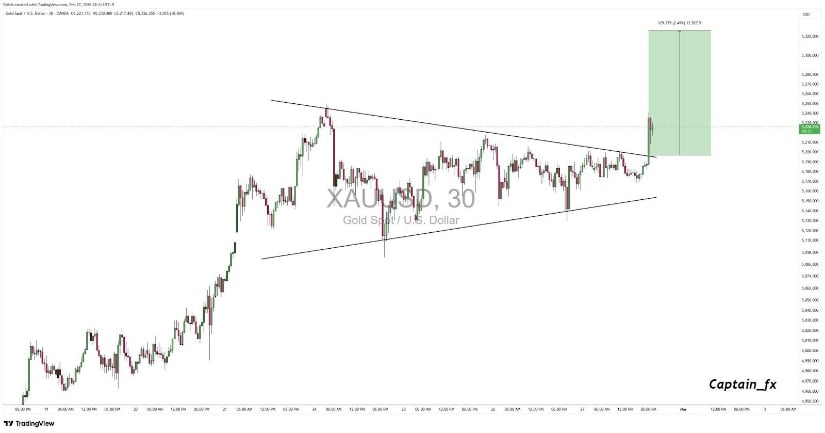 The 30-minute XAU/USD chart confirms an upside breakout from a symmetrical triangle near $2,729, signaling potential for continued bullish momentum in gold prices. Source: Captain Faibik via X