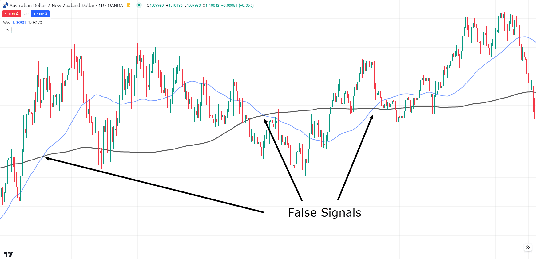 This can happen when short-term price fluctuations cause the moving averages to cross but do not result in a sustained trend.