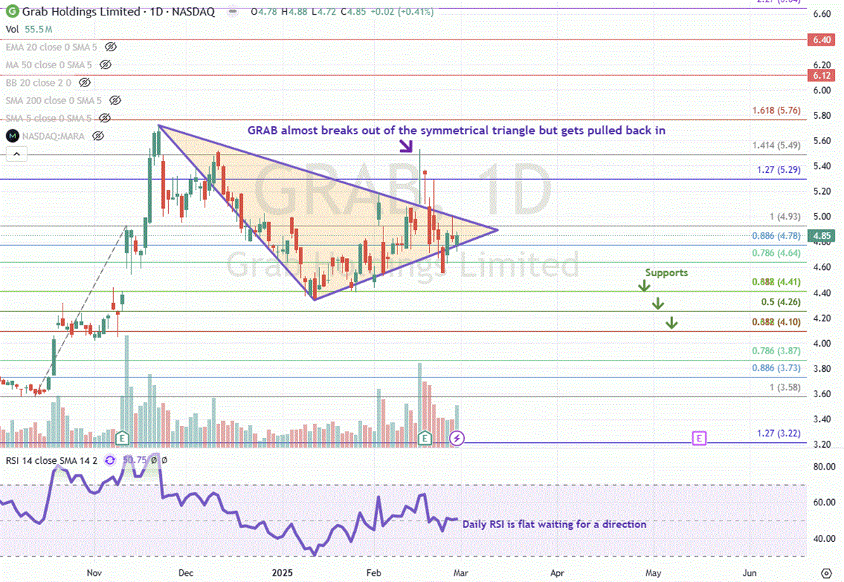 The Q4 earnings results were robust enough to trigger a breakout attempt on the daily symmetrical triangle but faced profit takers, causing shares to get pulled right back into the triangle. The immediate Fib supports are $4.41, $4.26 and $4.10.