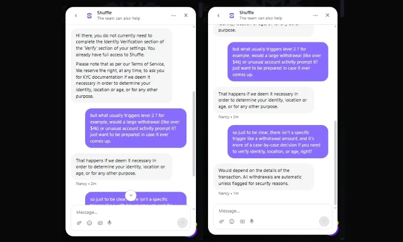 Importantly, Shuffle’s system is largely automated, and withdrawals typically process without manual intervention unless something is flagged. For the average player operating normally, Level 2 remains the exception, not the rule.