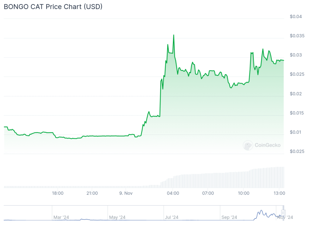 Bongo Cat is priced at approximately $0.02922 and is currently up 150% at last check on Saturday — the largest-gaining digital asset on CoinGecko.