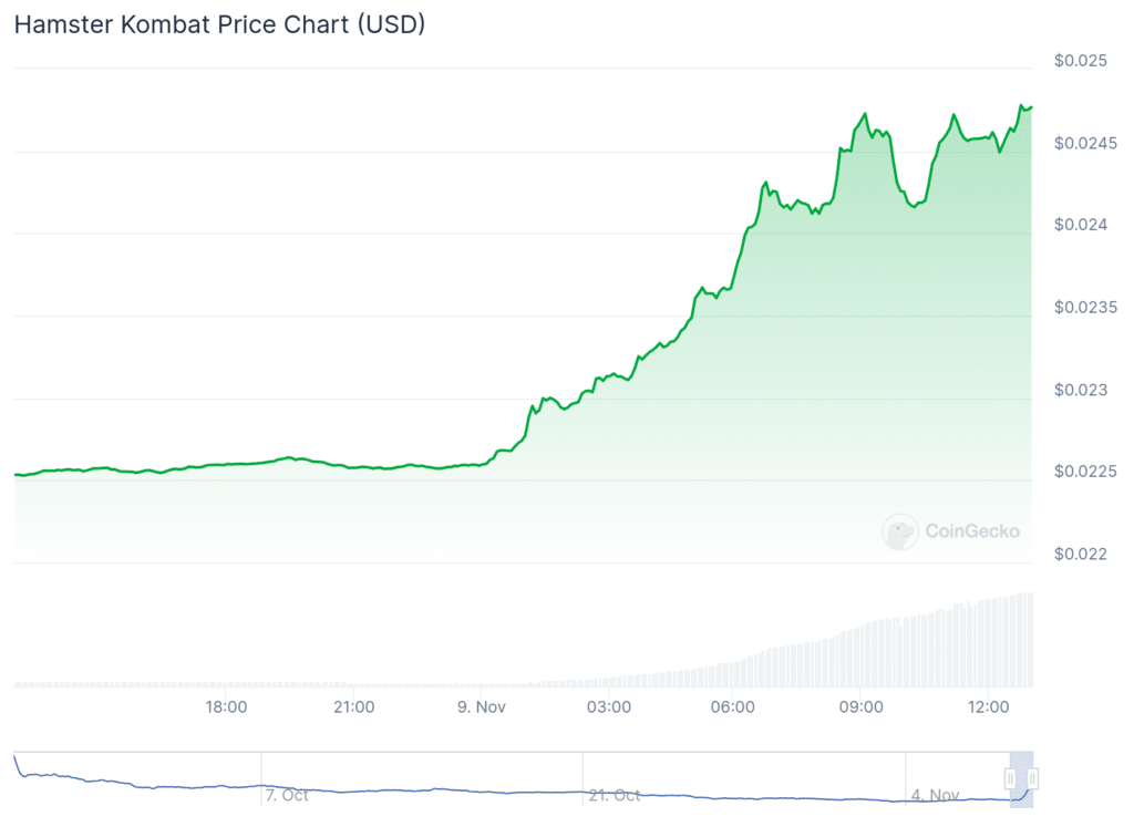 Hamster Kombat is up over 110% from its all-time low price of $0.002263 six days ago.