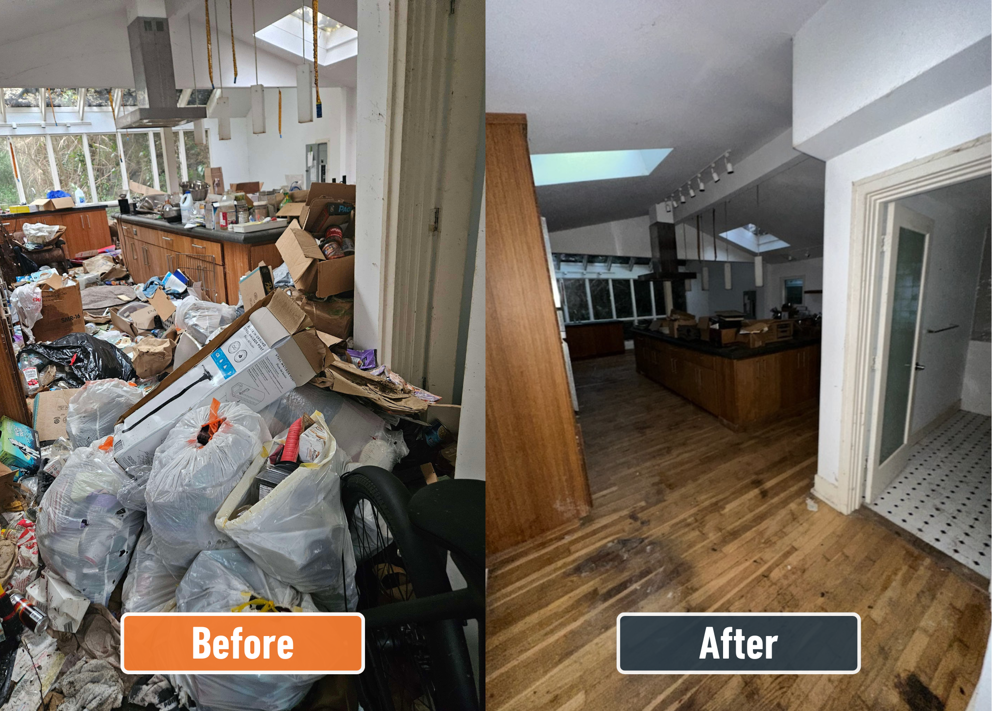 From chaos to clean: HazardPros restores a heavily cluttered kitchen into a spotless, safe living space.